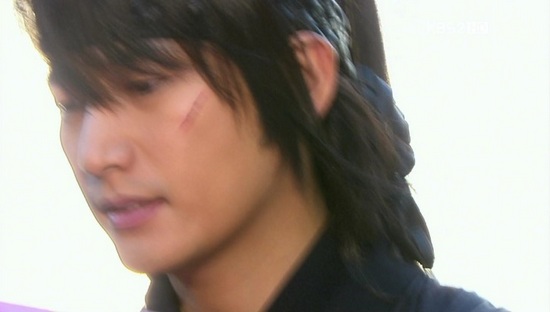 普通は切りませんよね。首絞めて、身代わりに矢にうたれて以来、初めて主役二人がいい感じで接近する超重要場面なのに。ホワイ、なにゆえに??とまたしても聞きたくなってしまいます。(笑)