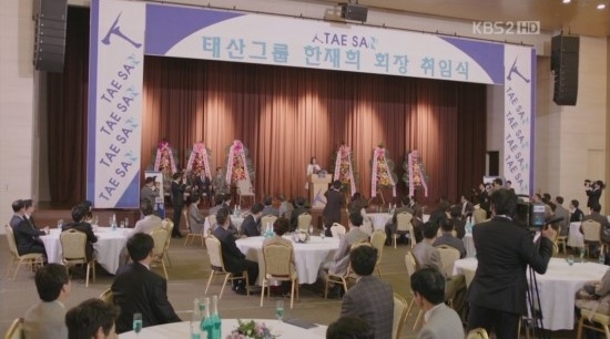 『ハン・ジェヒ会長就任式』の文字を見上げるマル。