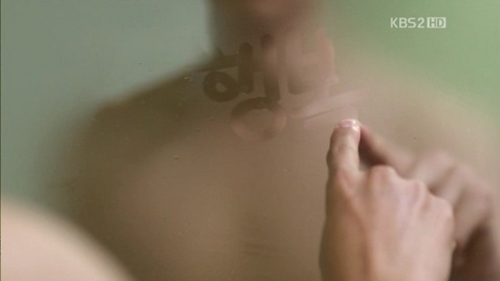 湯気で曇った鏡に「幸福」と書いて、照れたように消す、幸せそうな朝の風景。