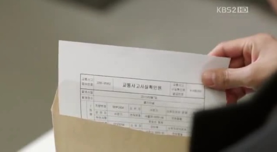 ウンギの机に、交通事故の内容を記した封筒を置くマル。