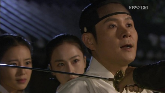 シン・ミョンはセリョンの首元に刀を抜いて見せ、スンユを脅します。