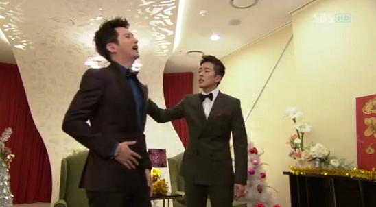 嬉しさのあまり、スンジョはトンウクに抱きついて持ち上げます。