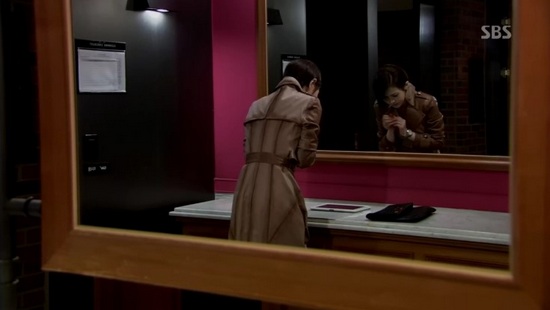 セギョンは携帯を手にとると、スンジョを待たせ化粧室に入ります。